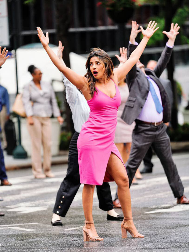 Priyanka Chopra looked pretty in pink with a thigh-high slit with brown block heels and beach wavy hair. With years of experience in Bollywood, dancing for a Hollywood film was simply a piece of cake for the actress. She looked pretty happy and in great spirits as she dance along several dancers. After the song shoot, they wrapped up the film. Priyanka shared a group picture with a caption that read, “And it’s a picture wrap! Such a fun lot to shoot this movie with. Adore u all.. #isntitromantic.”